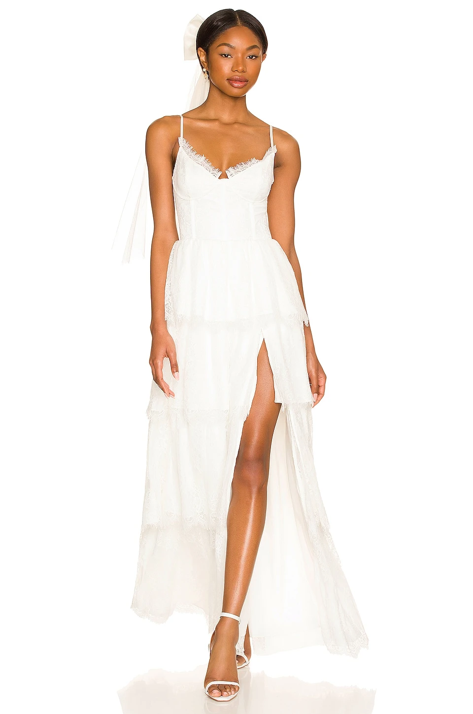 - Tiered eyelash lace fabric with side seam slit