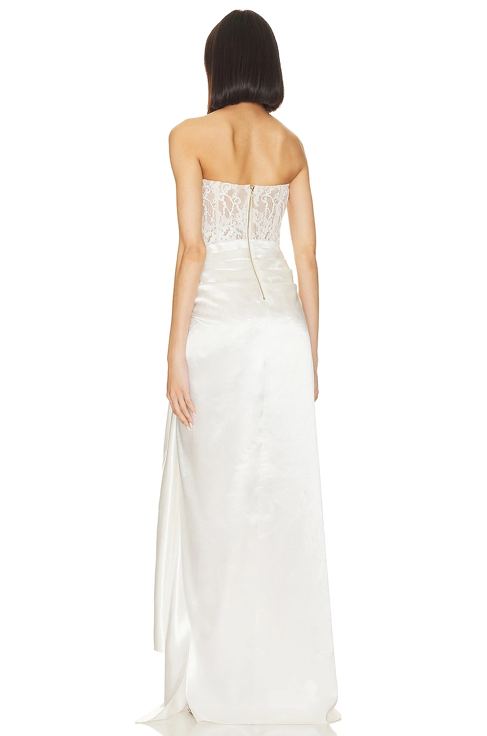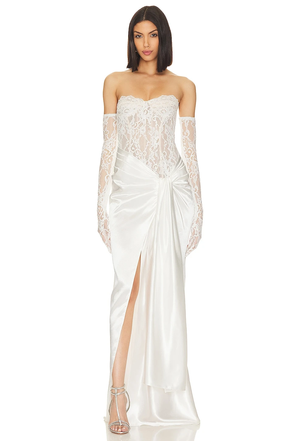 Tissu dentelle et jupe satinée drapée et fente couture côté - Gants en dentelle inclus