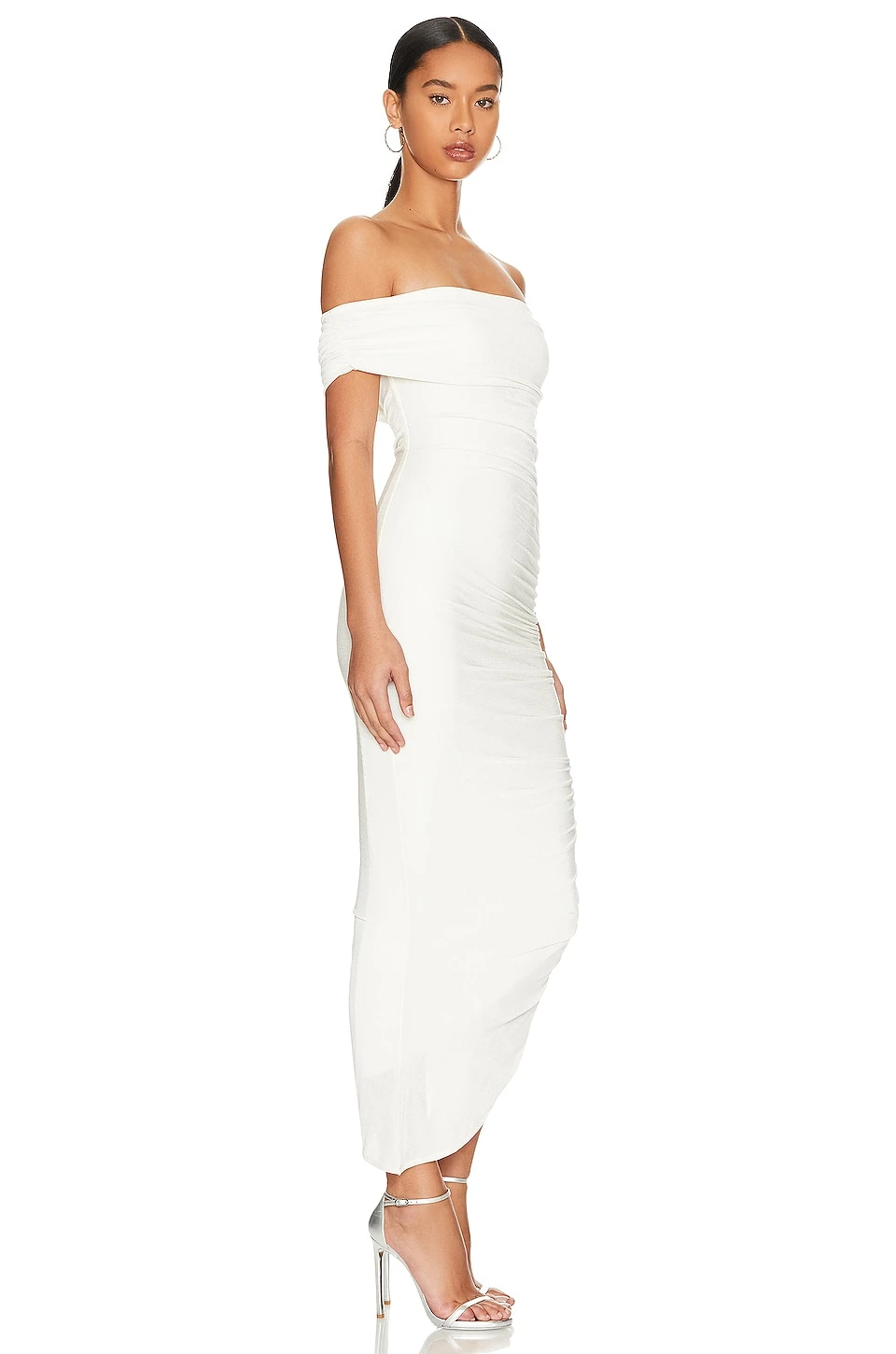 - Ruched slinky fabric with asymmetrical hem