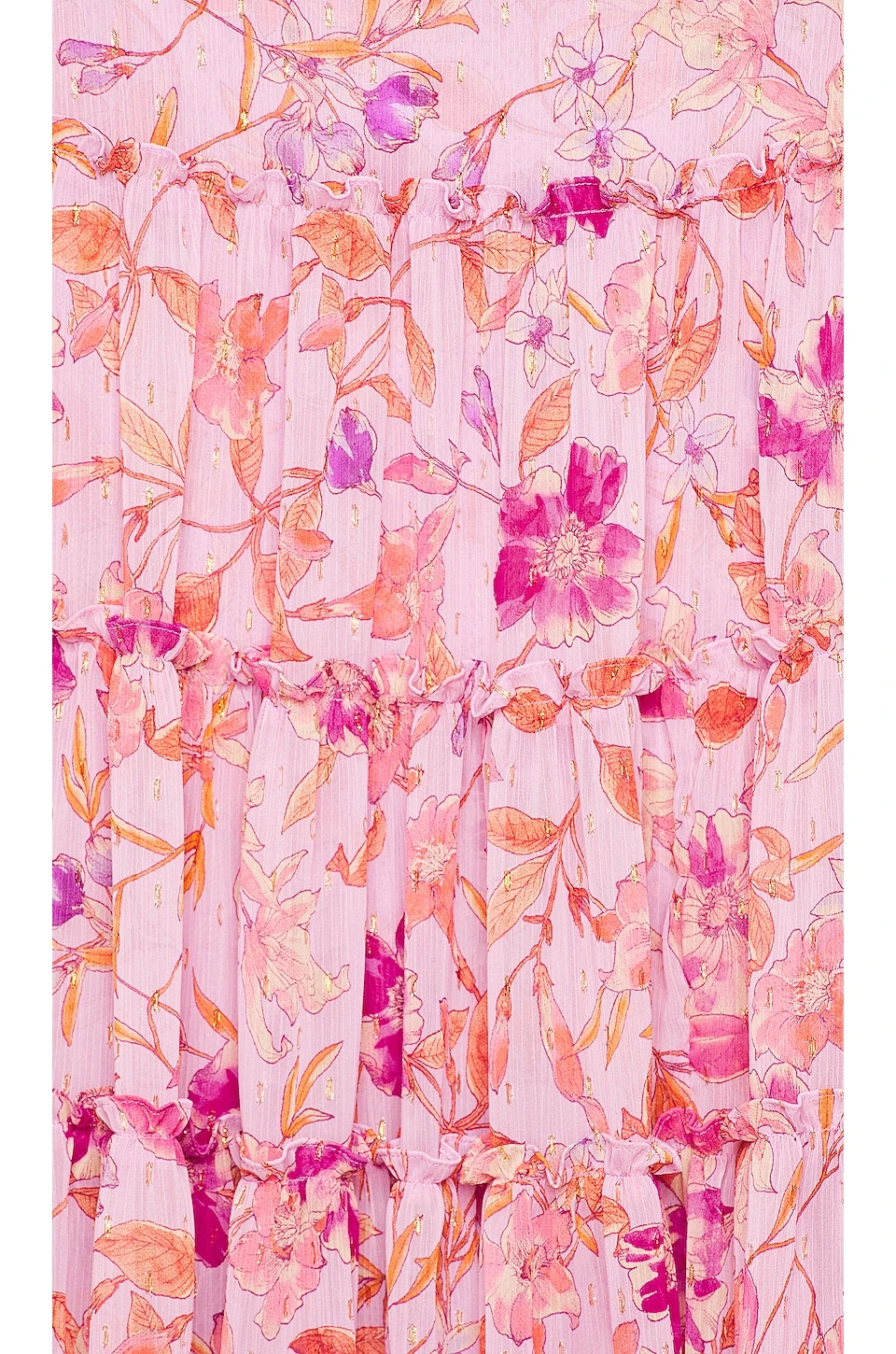 - Chiffon fabric with subtle metallic threading and ruffle detail throughout