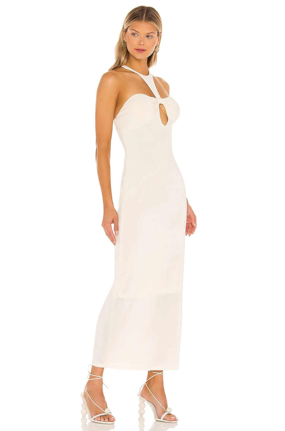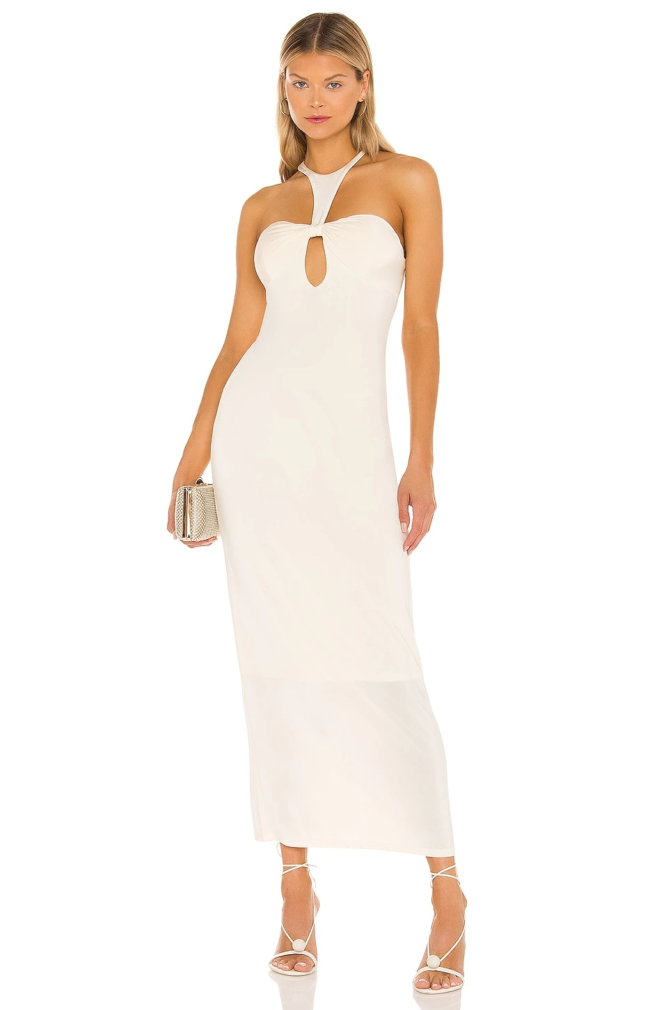 95% viscose, 5% Lycra. Fabriqué en Chine. Lavage à sec uniquement. Entièrement doublé. Hidden side zipper and halterneck hook and eye closure. Bonnets ampliformes. Tissu jersey fluide avec découpes devant et dos. Revolve Style N° RONR-WD441. Fournisseur Style N° 11-82068JSY.