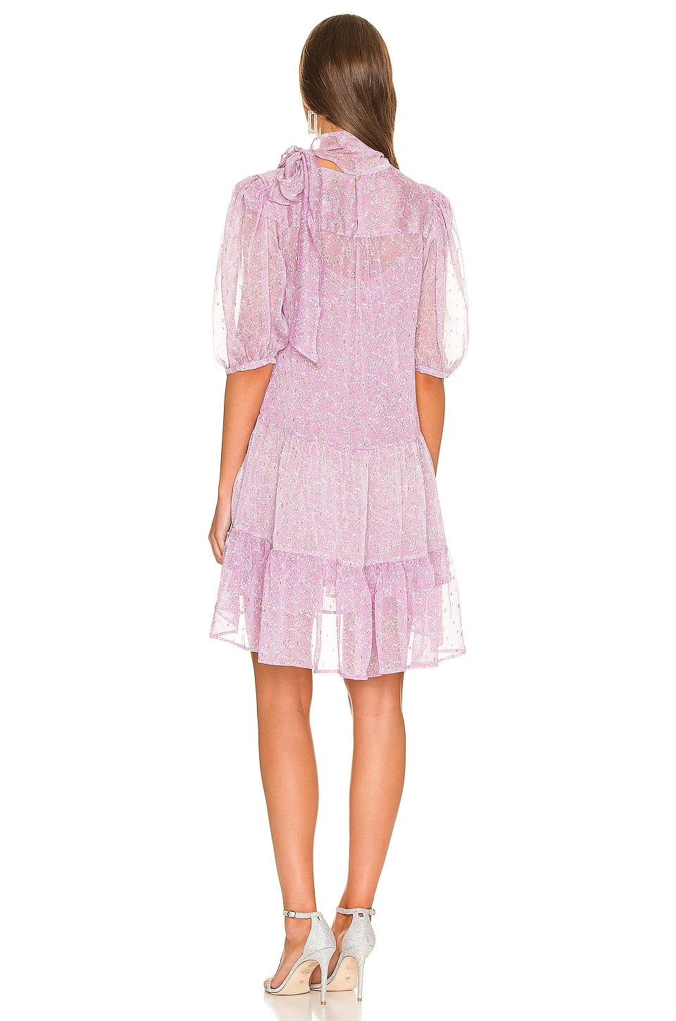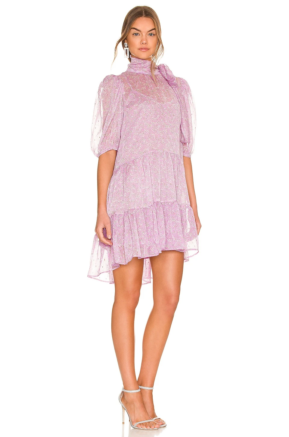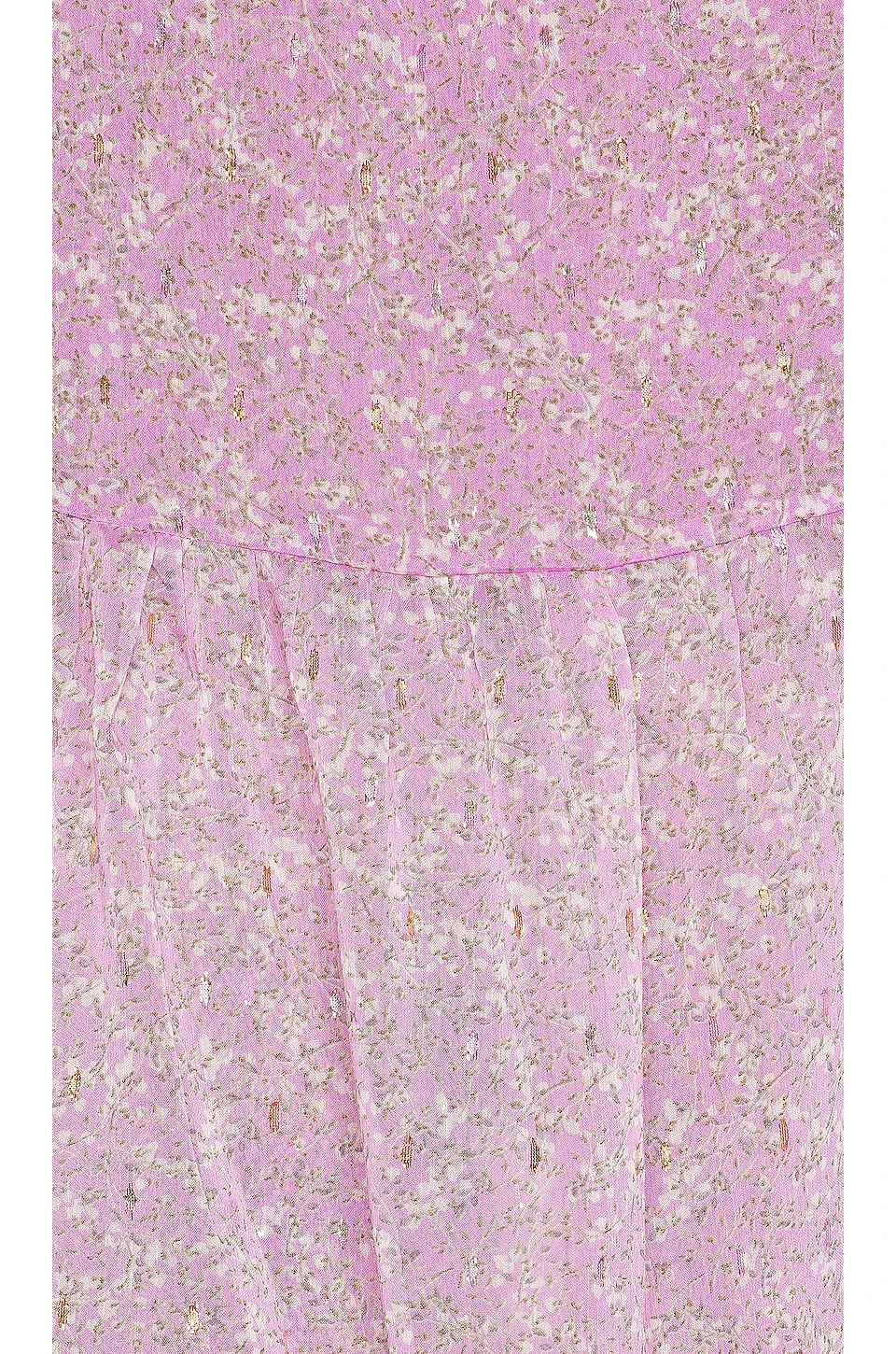 - Flowy chiffon fabric and gold-tone lurex threading with floral design and ruffle hem